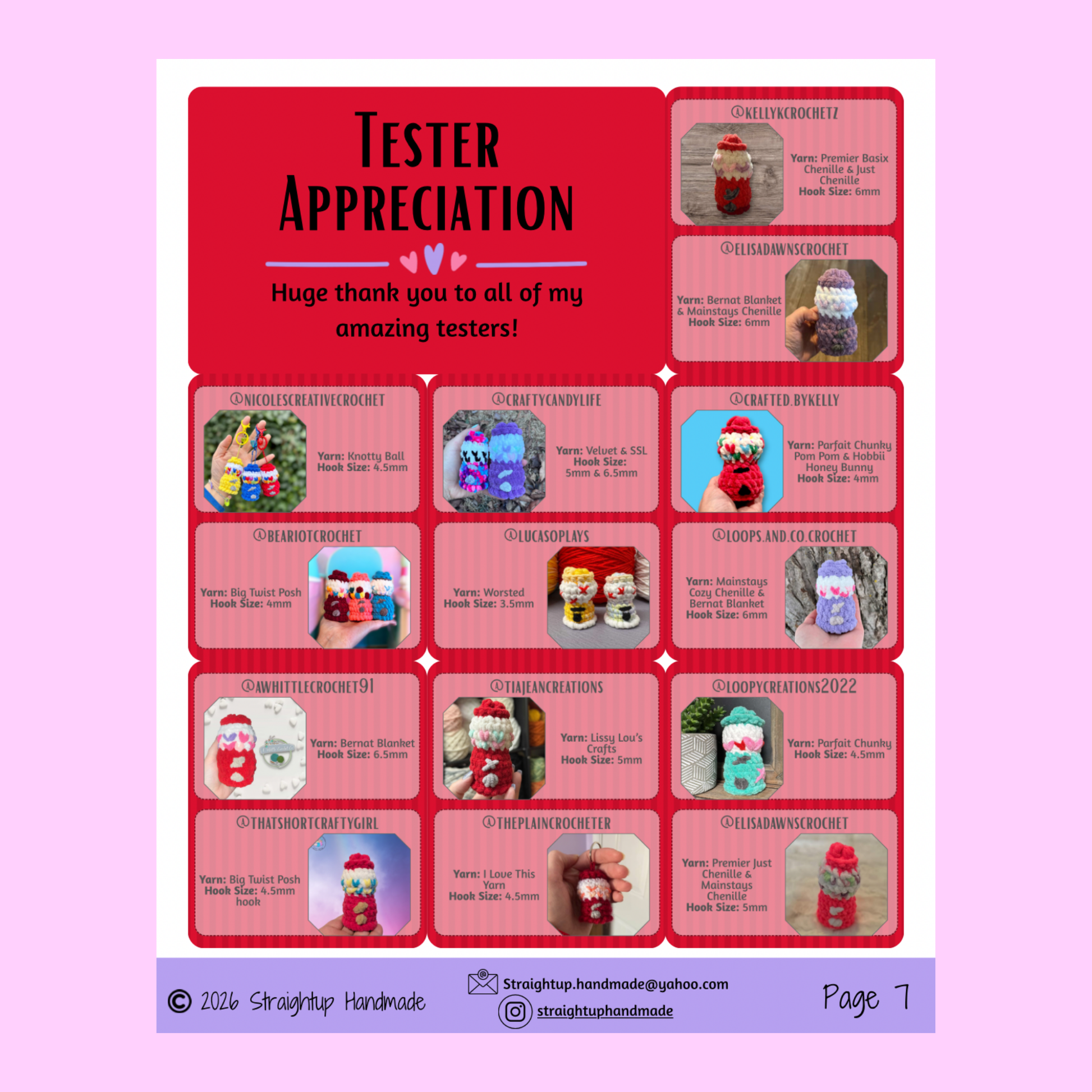 Also included in pattern: yarn type, hook size and eye size from all testers & myself.